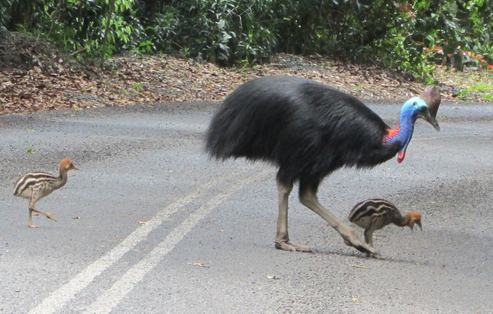 A few weeks ago in Kuala Lumpur we had been amazed to see the Cassowary, a large EMU type bird which was about 1.5 high with lovely blue, red and black plumage. They are very rare and a lot of locals we had spoken to here have never seen them. But as we rounded a corner, driving carefully at 50kph (because of yellow Cassowary signs), there was a male bird and his two chicks. Now the observant amongst you will have read “male”, perhaps thinking I missed out the two letters FE. Well no, I am right. The lady bird gives birth and when the chicks are hatched it is the Dad, yes the Dad that looks after his offspring for the next 14 months before they become “adult birds”. I was very impressed with this male bird – it reminded me of bringing up Joe in the same diligent way 23 years ago… or maybe not (Editor, Sarah).