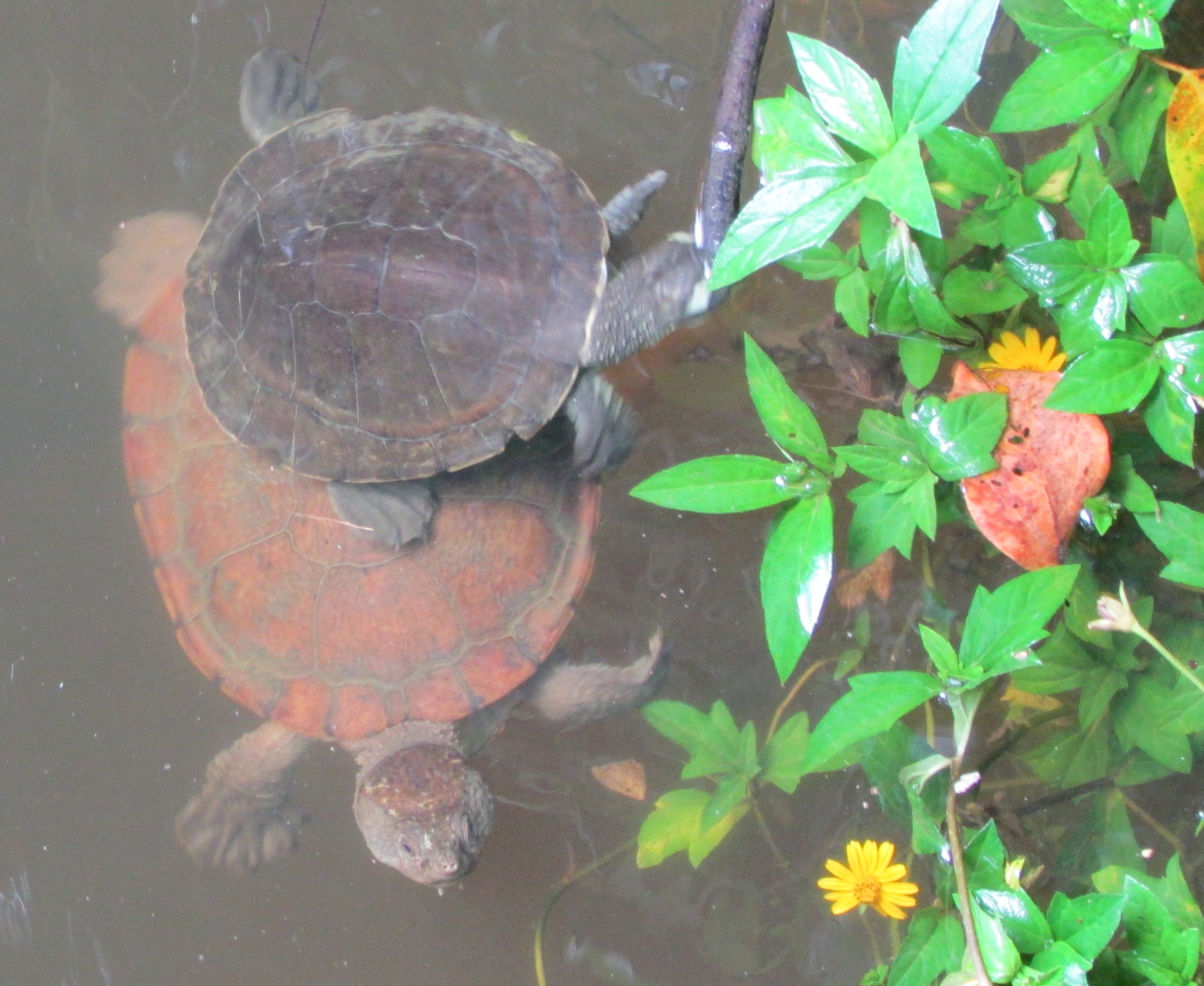 We got a good distance into the jungle, sweat dripping through near 100% humidity. Baby turtles in small pools said hello and more giant lizards, scuttled off in search of cover.