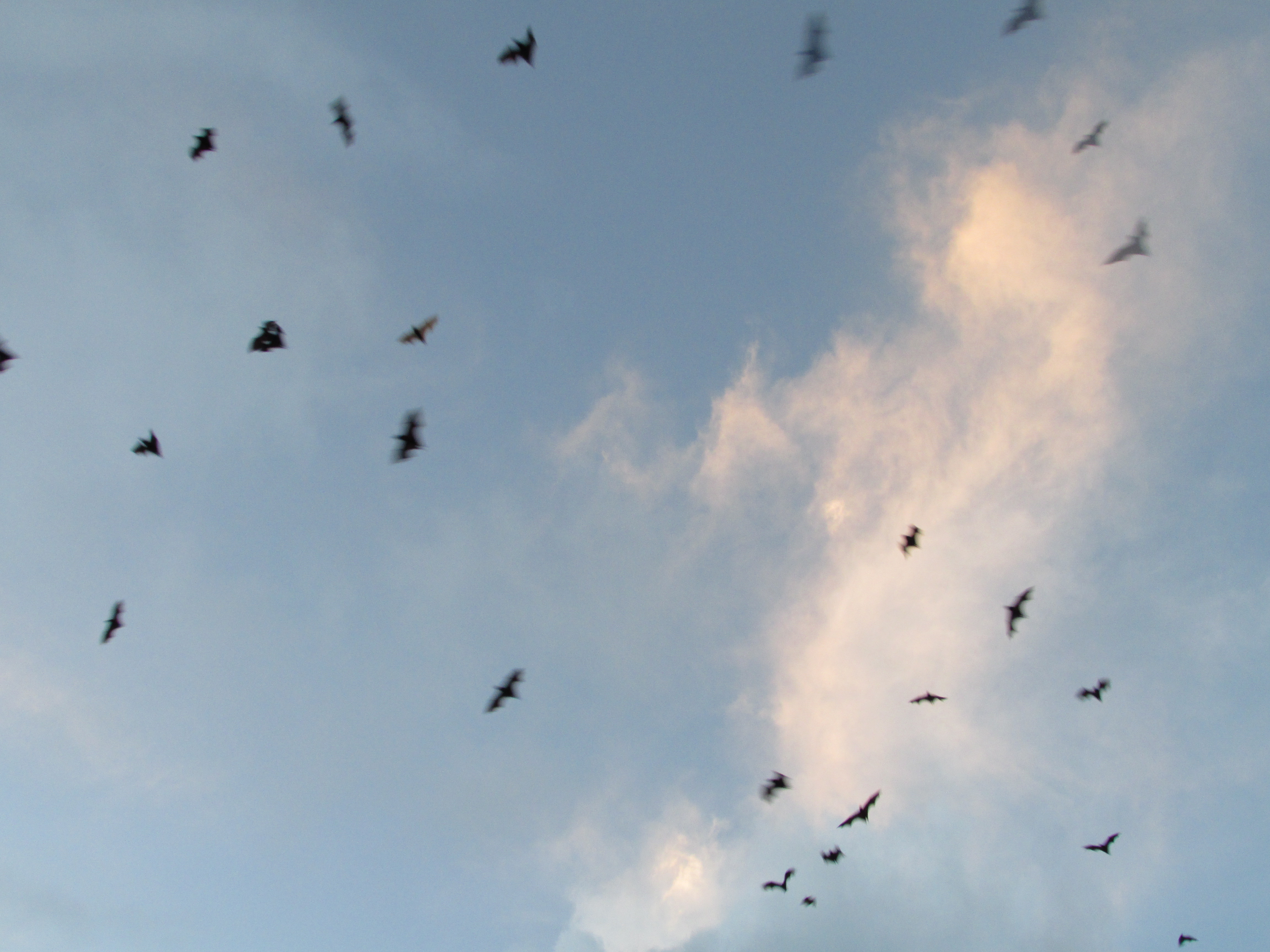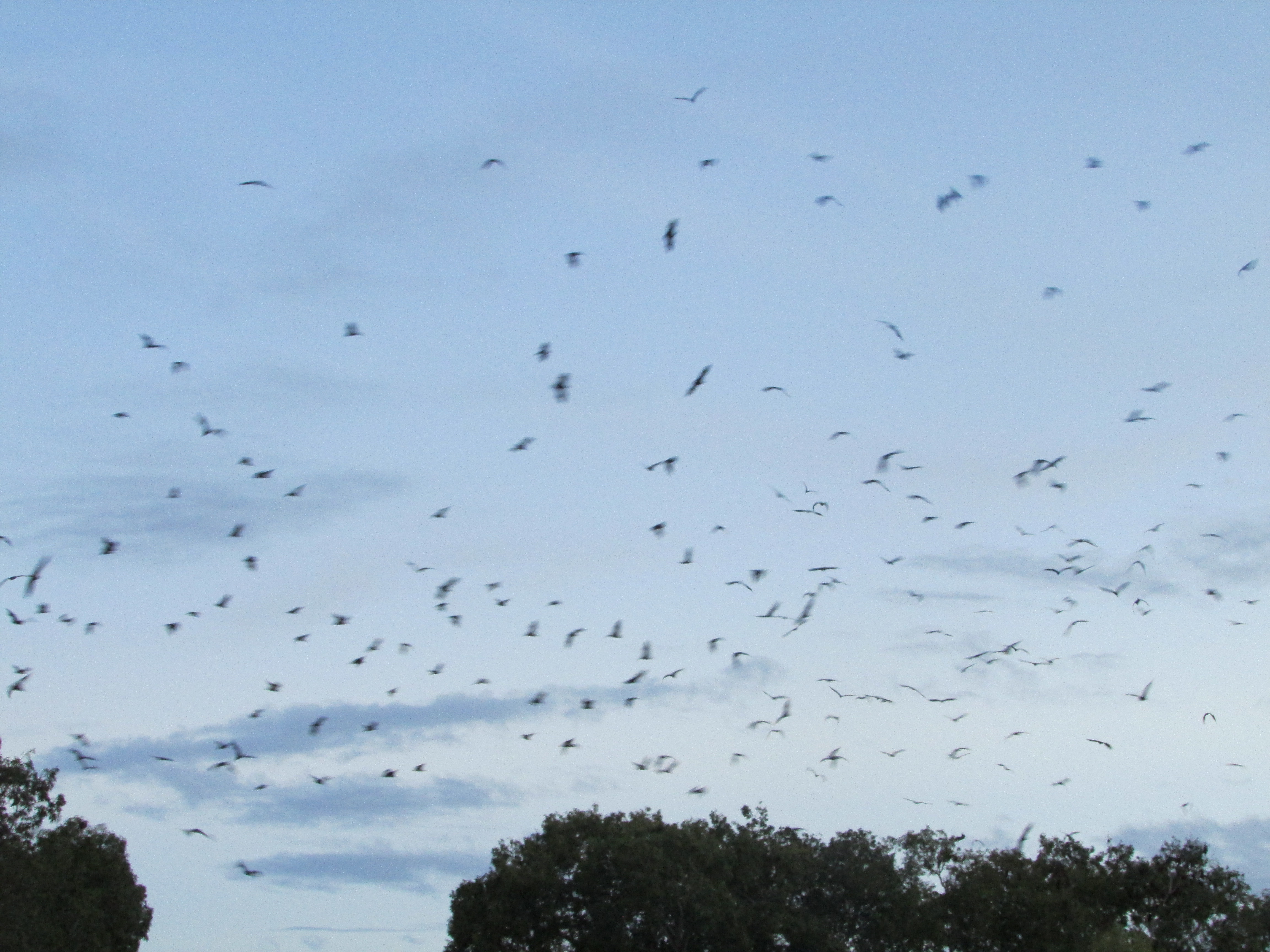 He wasn’t’ wrong. Bang on 1900, the sky was blackened as wave after wave of Fox Bats, decided not to hang upside down anymore on their eucalyptus tree branches, but instead head off to the Rain Forest some 15kms away for their evening feed. I mentioned Skippy earlier on, well now it’s time to name check Scooby Doo and that opening scene as the bats take off or throw in the Adams Family as well to the mix and you get the sort of idea. These mammals have a wing span of over a metre and could poo from a great height, all over the hire car which was white but soon had fruit stains all down it over the roof and windows. Unlike certain nationalities I could name, the bats took off in sequence, with each group joining the back of the queue before heading off in the fading light towards the distant hills. I tried to get some good shots, but sadly the ones below are the best that I could do.