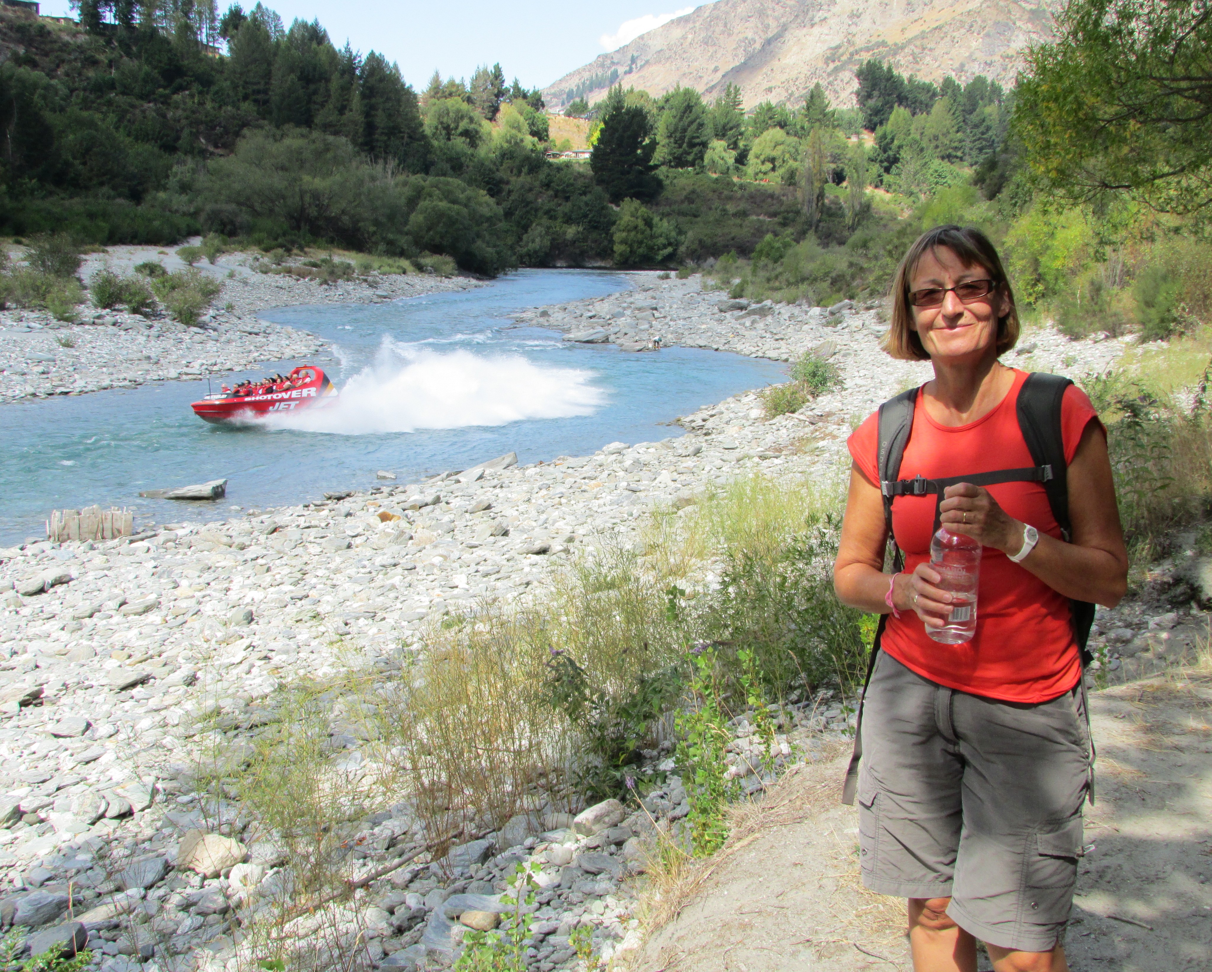 So we were walking along a river just north of Queenstown on a short two miler, when the World famous SHOTOVER JET BOAT, roared past at a speed of 50 mph in a river no more than 6 inches deep. Sarah’s red T Shirt matching nicely the red of what is a “Ferrari on water.”