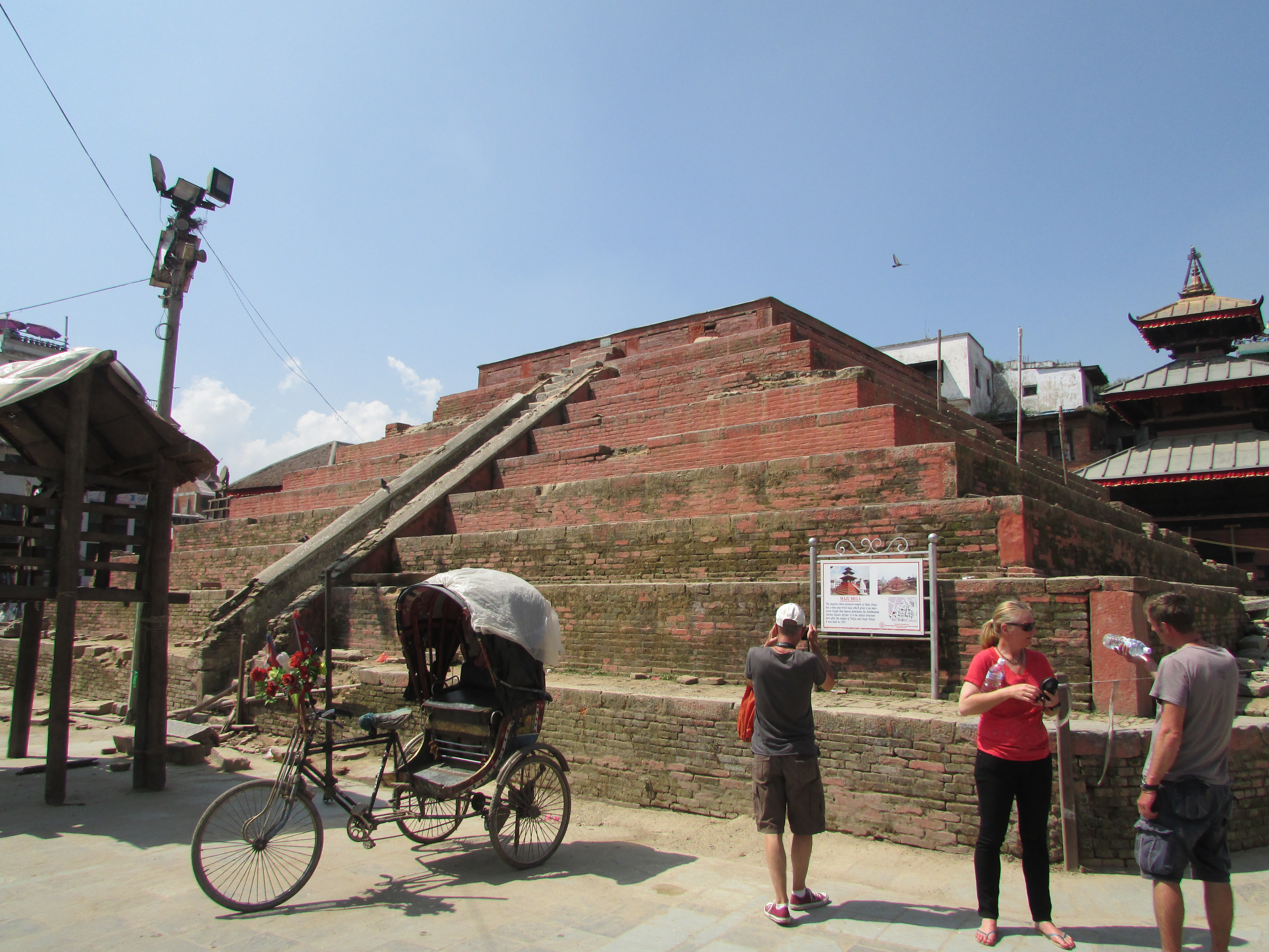 So, next morning, after a roof top breakfast overlooking the misty mountains, we set out to investigate for ourselves the Thamel (old town) area. Sadly it wasn’t long before we could see for ourselves the massive hammering the old temples and shrines had taken. The poignant “before” photos now displayed by the Government Tourist Service showed what the buildings had been like a few months ago. My photos show what is left. Enough words, let the photos speak.