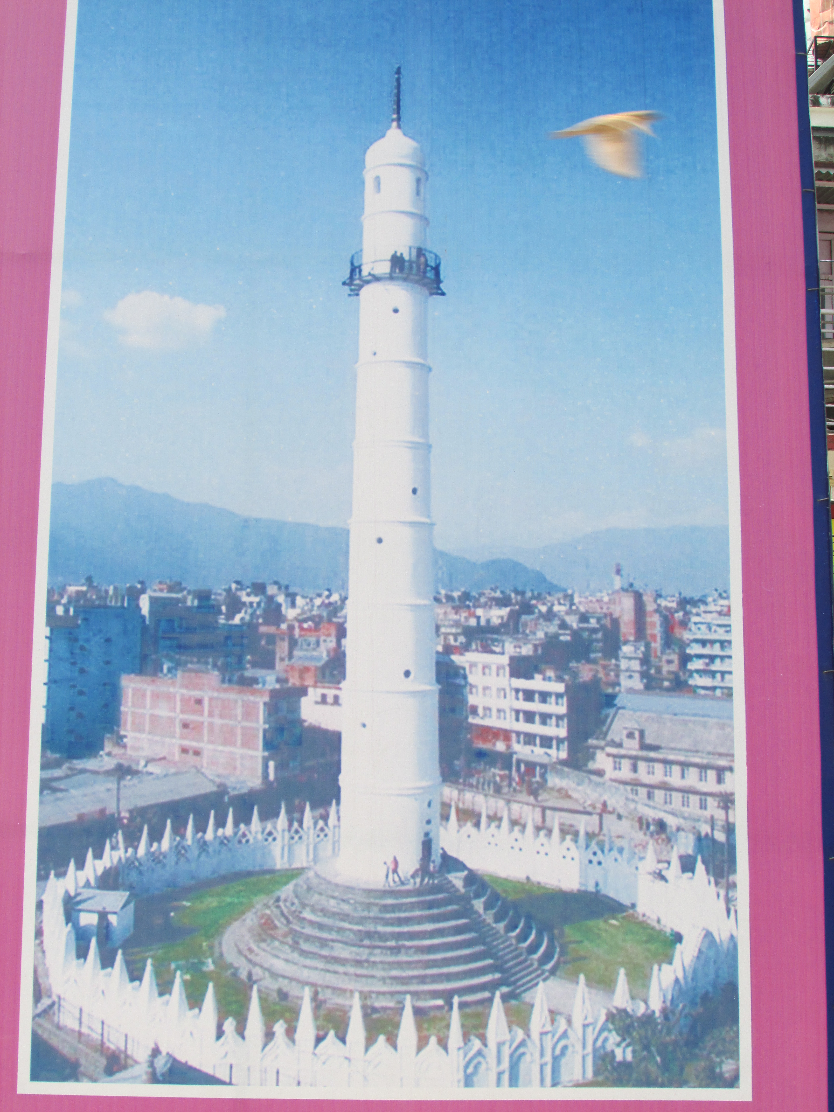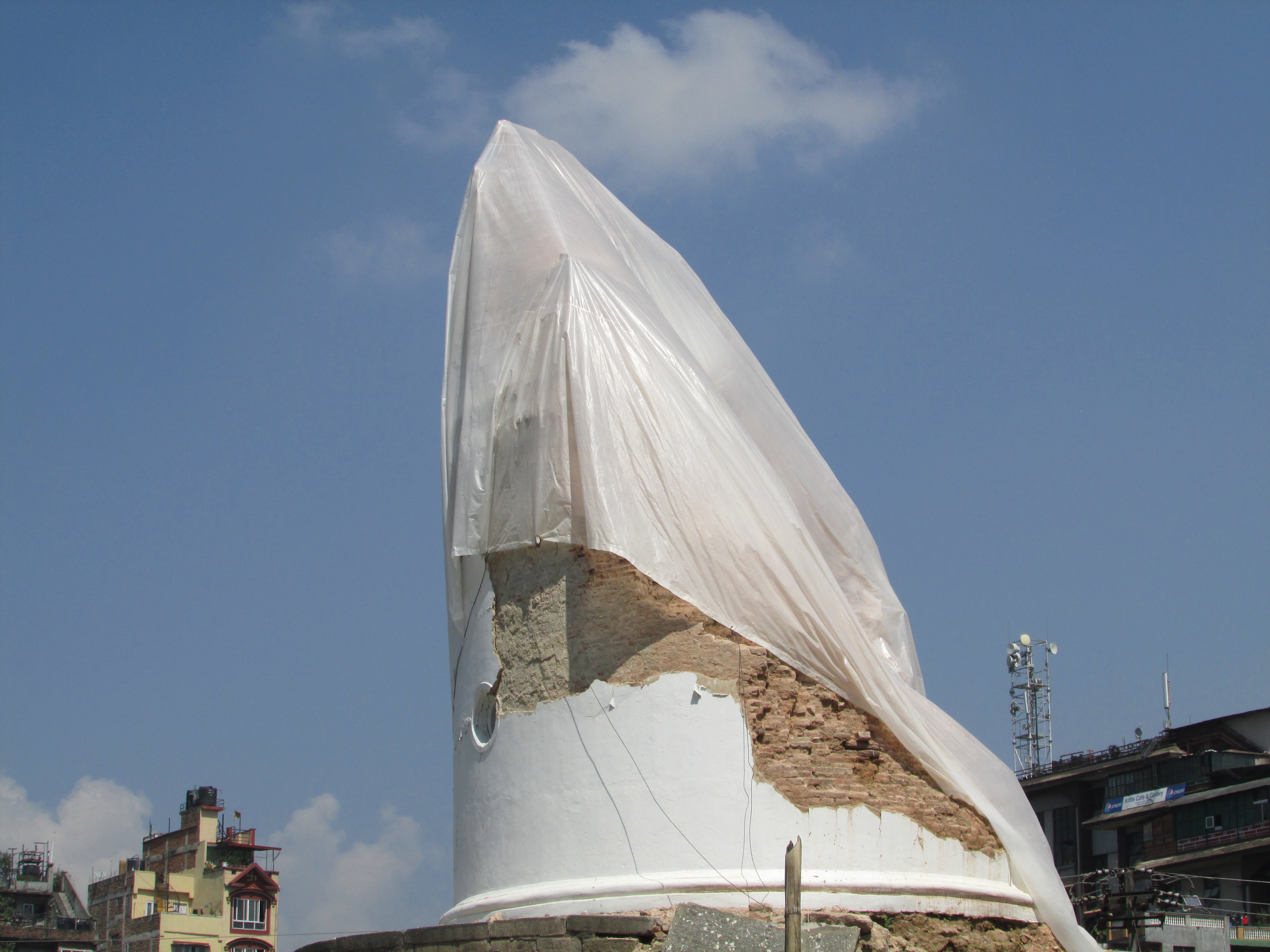 The most striking image of sadness was the 10 metre tall white stump – all that remained of the Dharaha Tower. This historic white “lighthouse” shaped building, built in the 19th century was a major attraction, the tallest building in the capital with a viewing balcony at the top. The Tourist Entry signs were still there, an eerie reminder of what had been. Now it was all sealed off with corrugated iron and a draped white tarpaulin, shrouding what was left as if a dead body had been covered by a sheet out of respect.