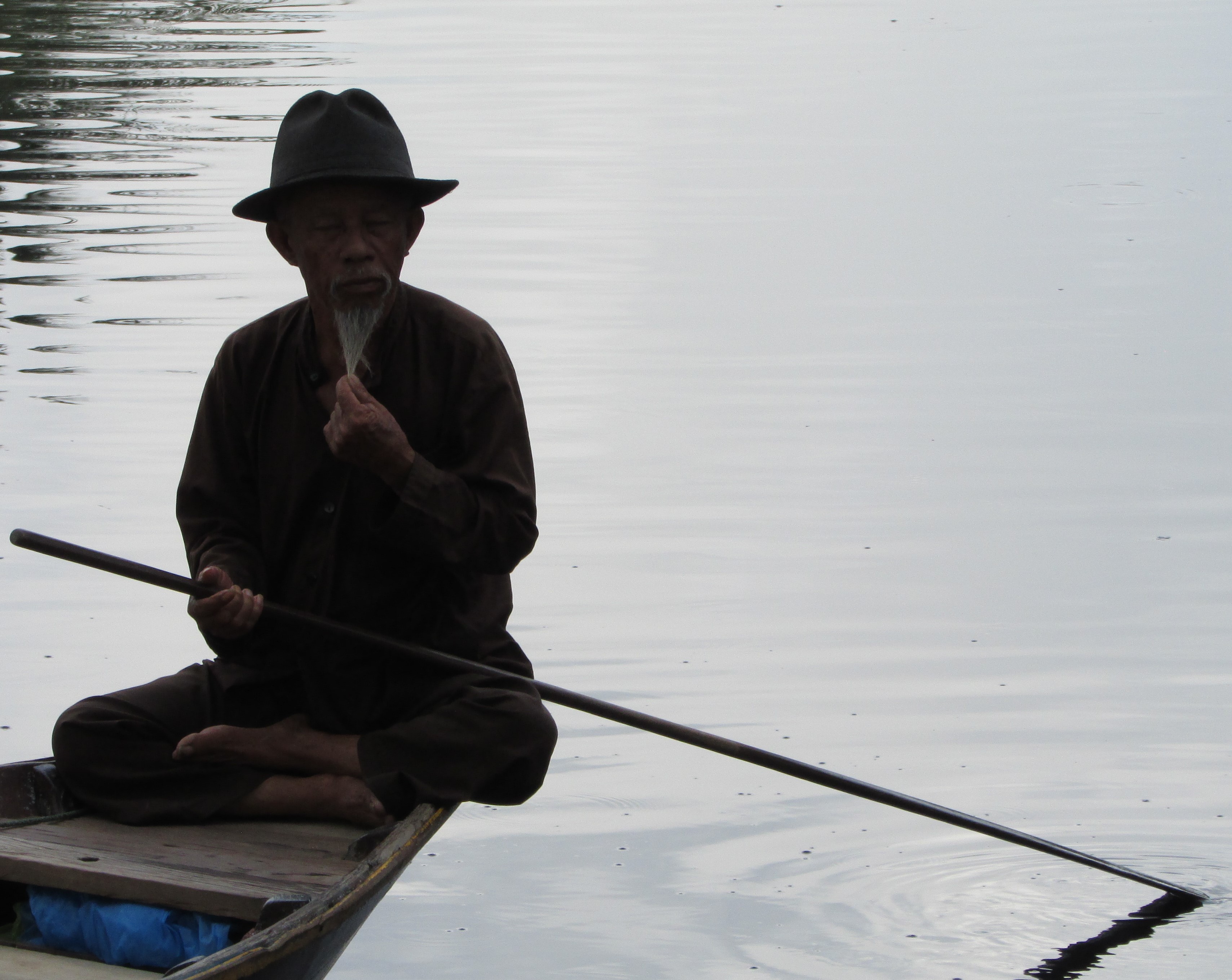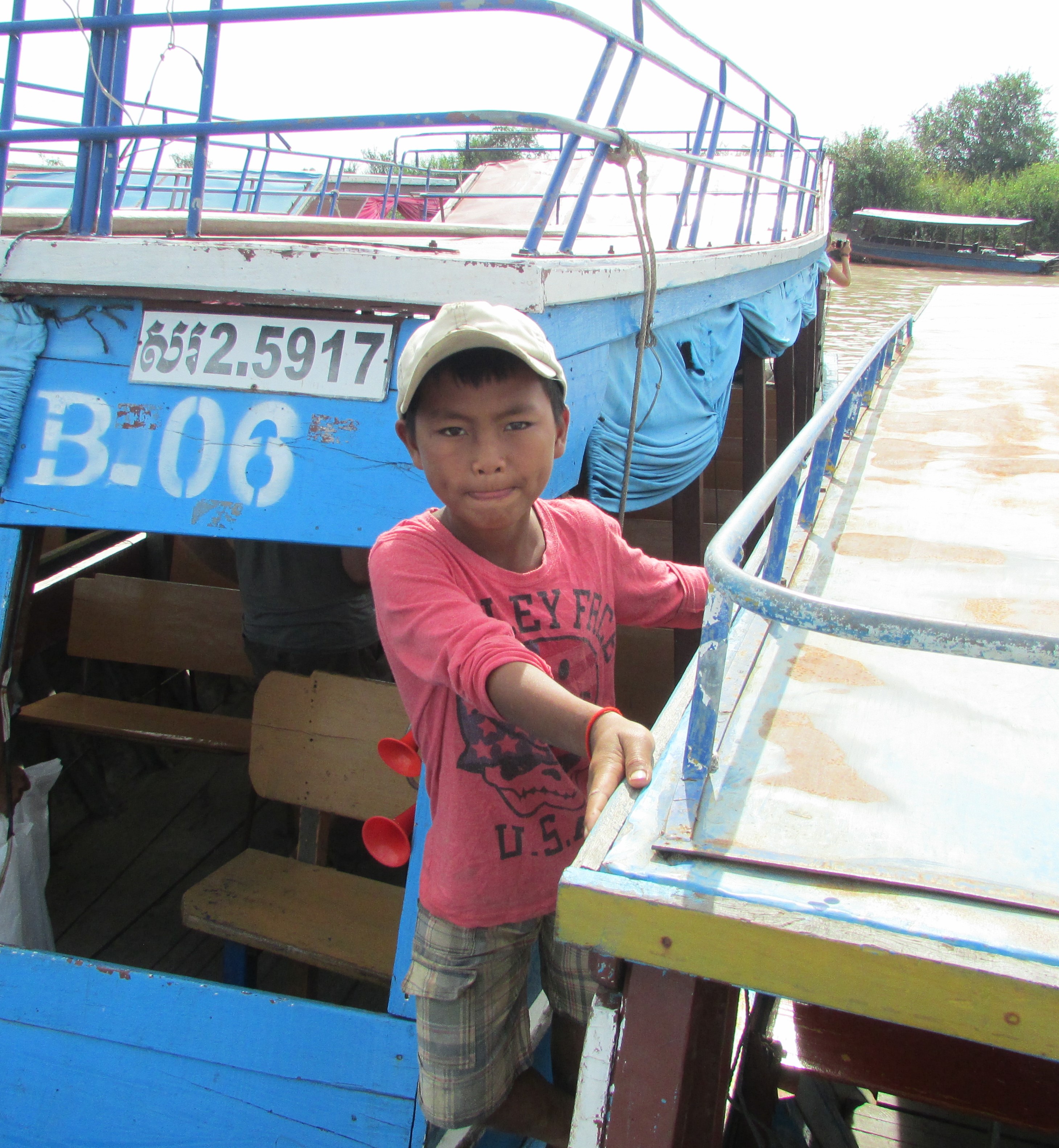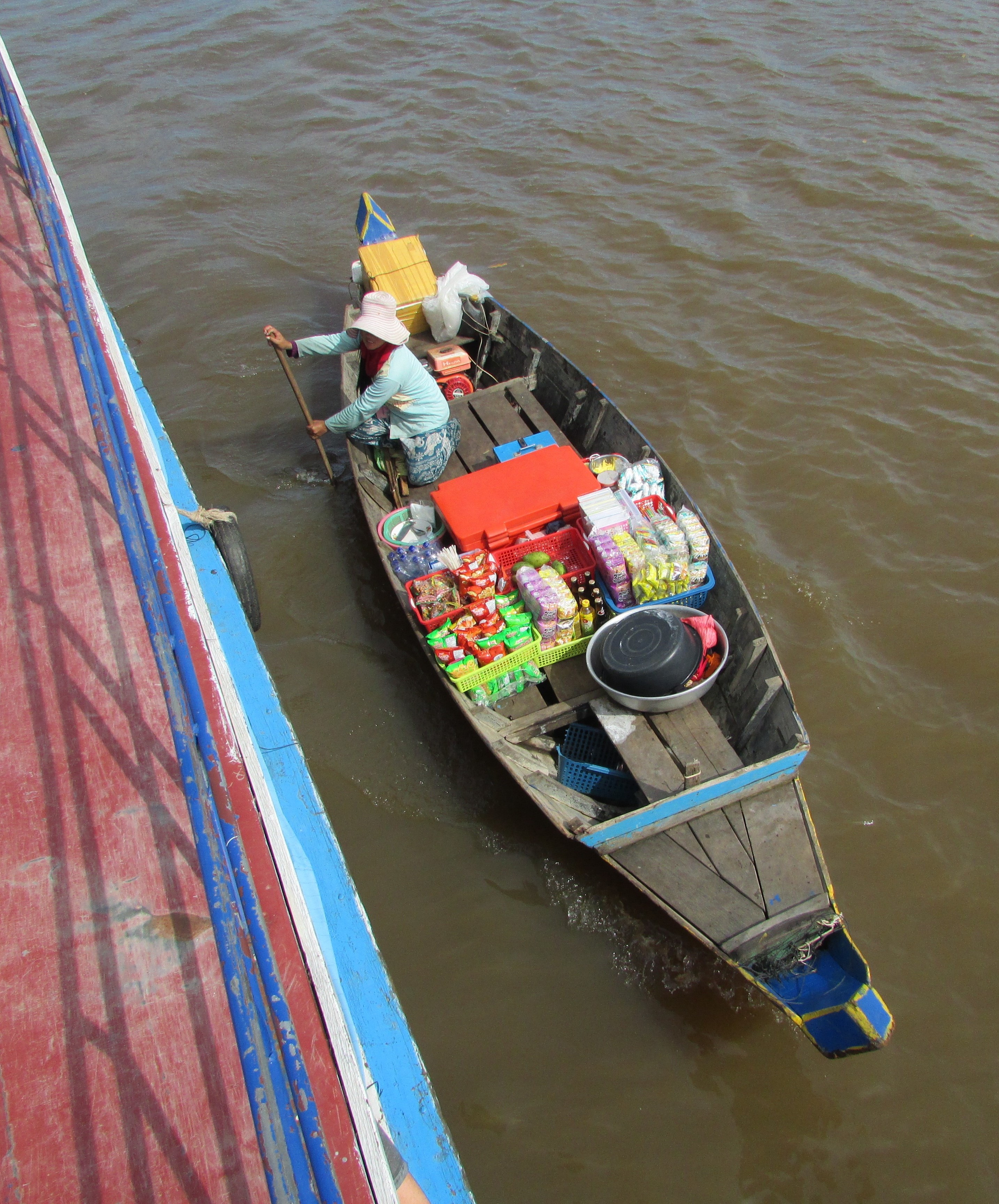 But where was the lake? The answer soon became clear as a shimmering mass of water glistened a few hundred metres down-stream. We’d made it to the edge of the lake proper. Nothing now to see, just the horizon and a local fishing boat being visited by a mobile 7/11 mini-mart, another small boat, another enterprising young business lady.