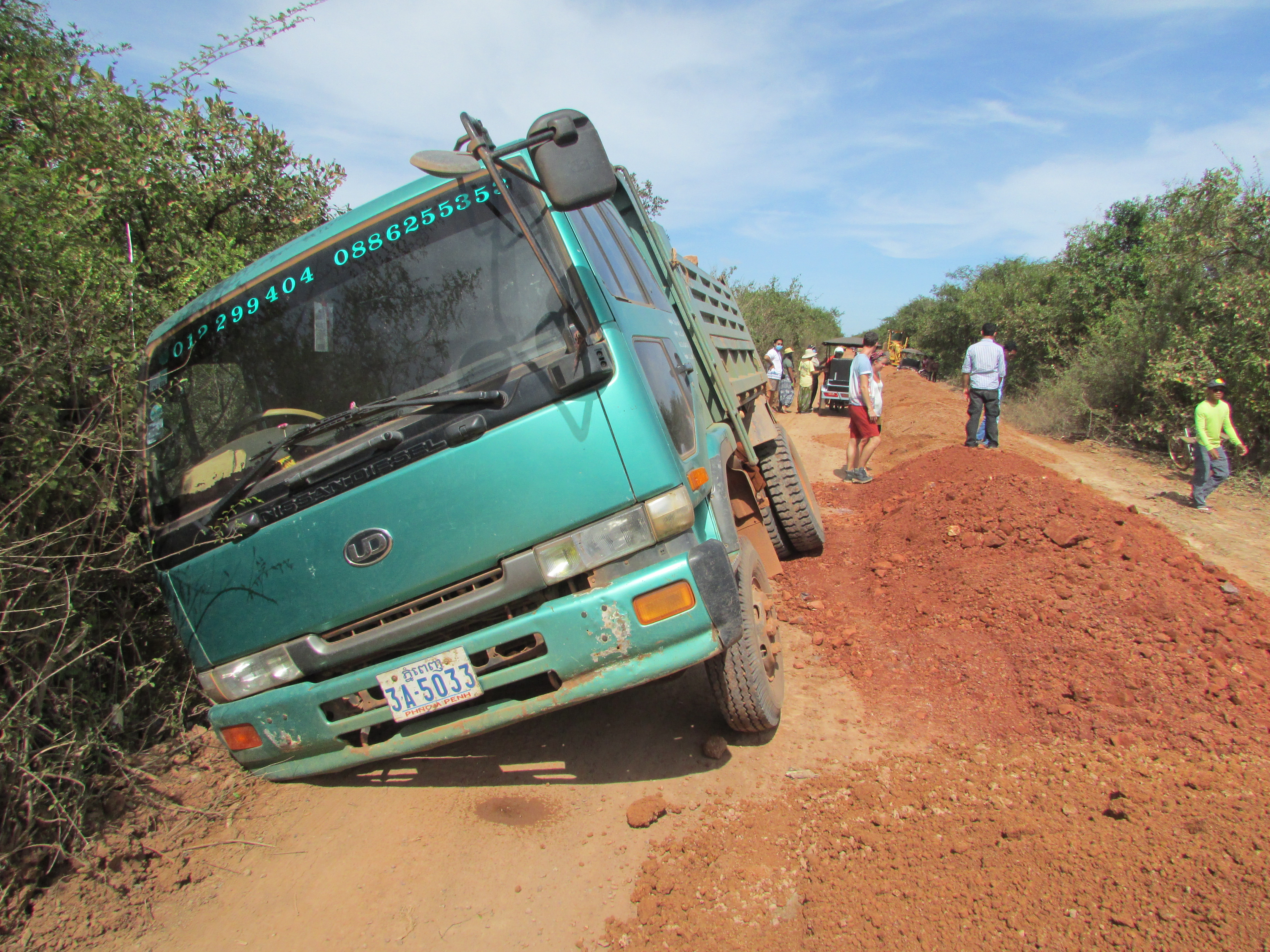 Just a couple of miles after boarding from the quay, we slowed down and stopped behind another bus. The reason soon apparent. We were driving on a compacted mud road, which along this stretch was being widened by additional soil. In the centre of the road was freshly tipped soil. To our left, a local lorry which had sunk in to the mango swamp and was now leaning at close to 45 degrees.