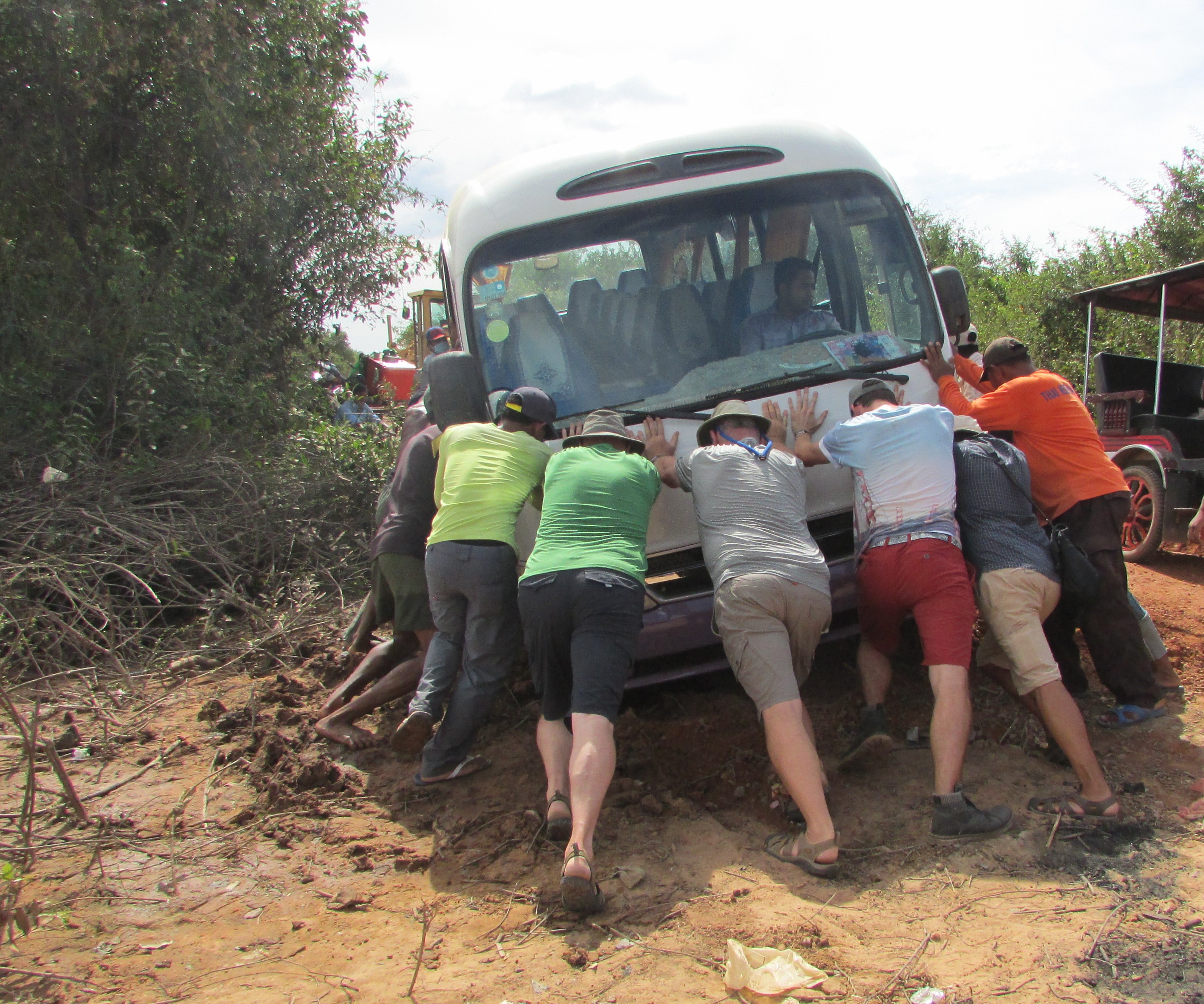 The road was blocked and remained so for about an hour, until a big yellow “digger/scraper thing” arrived managing to clear part of the road. The bus in front made it through and sped off. Our bus approached, did not quite get the line right and promptly began sinking/leaning at 35 degrees, the front right wheel caked deep in mud, stuck down to the axel.