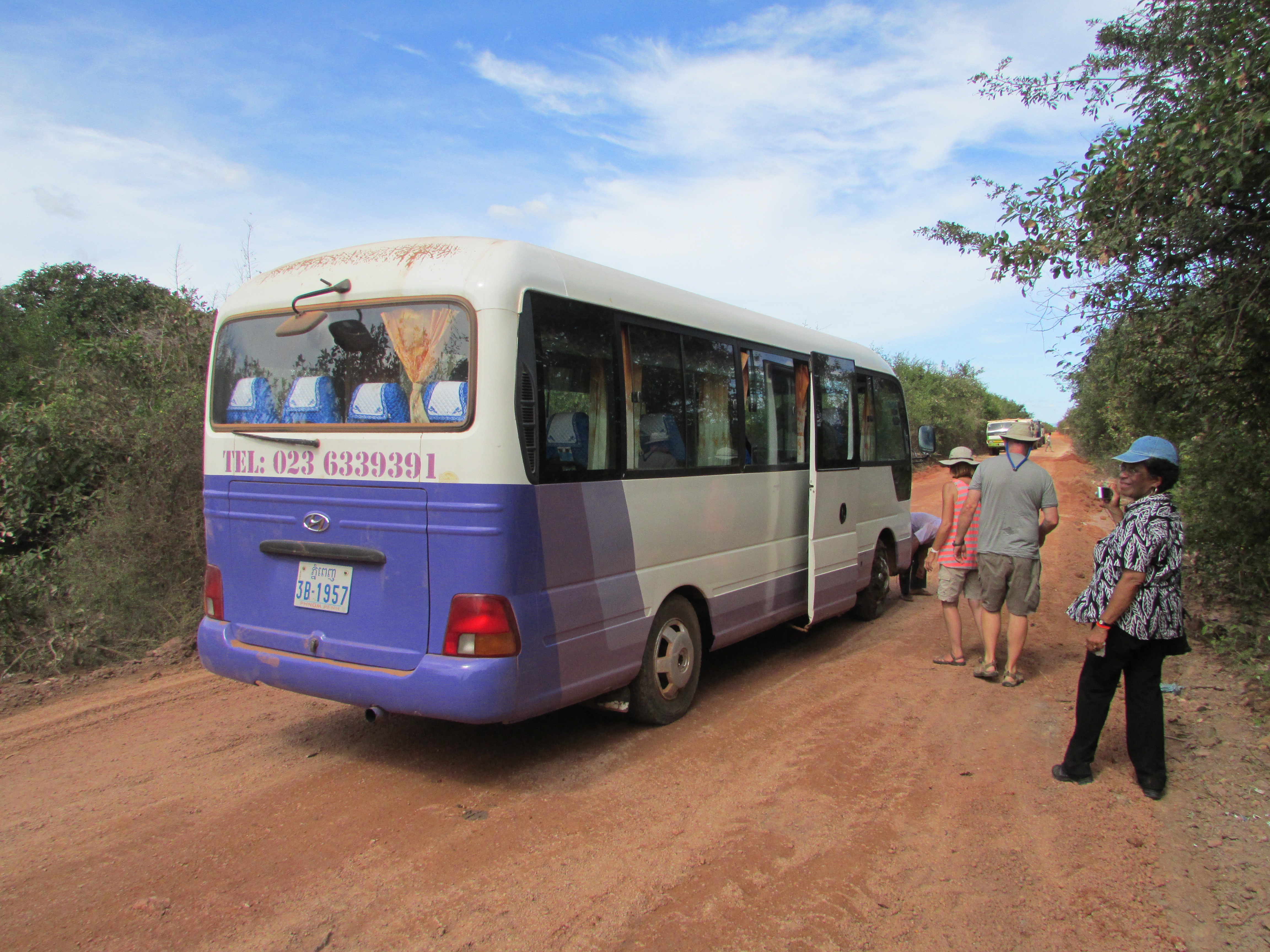 An hour out of Siem Reap (home of the world famous Angkor Wat) we travelled through lush countryside before racing across very flat land, paddy fields everywhere. Soon rice gave way to mango swamps. Knarled trees and bushes rose snake-like from dark brown water on either side of our raised dirt track just a few feet above the water’s edge. We bounced along, leaving a cloud of choking dust enveloping a poor motorbike behind us.