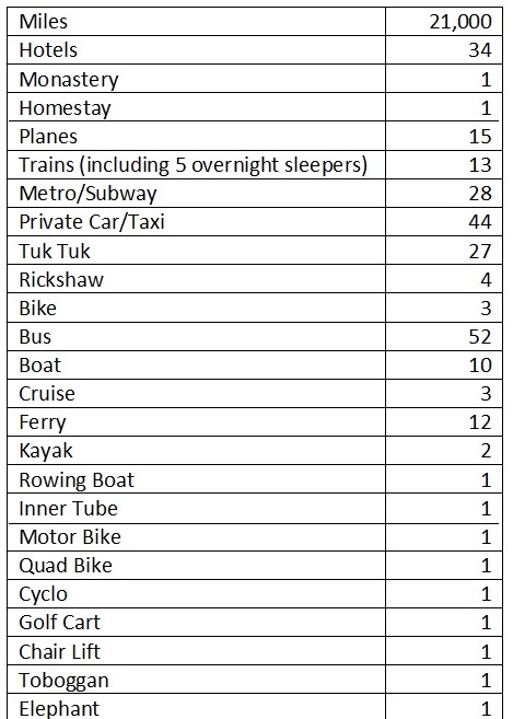 Yes, we’re sad arses. In Sarah’s little black book, kindly given to us by Lois and Keith Pope, we record all sorts of things from modes of travel to how much we spend on laundry. The stats above are 100% correct.